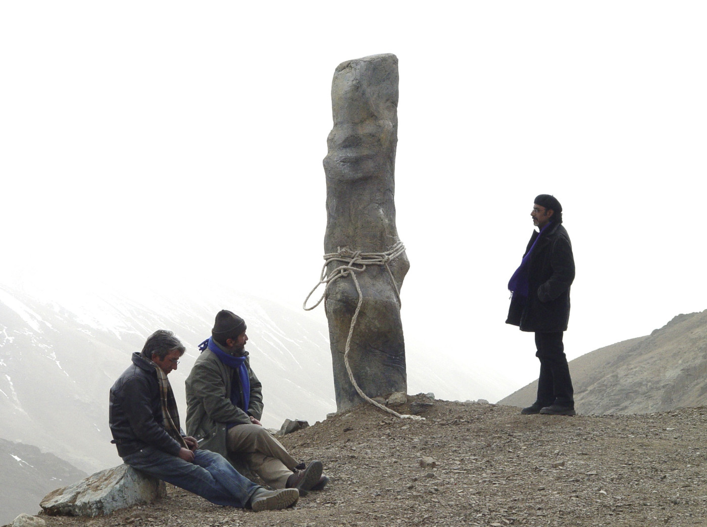 Podle námětu Abbase Kiarostamiho vznikla komedie o čtveřici dobře situovaných mužů středního věku, které cestou z lyžařského výletu zaujme velký, štíhlý, osamělý balvan na odpočívadle horské silničky. Z kratochvilného, navenek snadno proveditelného nápadu – povalit ho, nebo s ním alespoň pohnout – se rychle stává posedlost. Zprvu primitivní snahy přerůstají ve stále rafinovanější způsoby: lidské síly doplní osel zabavený pastevci, nastupuje moderní technika… Jak míjí den, na místo přibývají další osoby – kolemjdoucí, z města přivolané manželky, přátelé. Úkol se ocitá mimo síly a nakonec i úhel pohledu zúčastněných: zatímco skála dál stojí nepohnutě na svém místě, mezilidské vztahy podléhají stravující korozi… Vyprávění odehrávající se v průběhu jediného dne vyniká rafinovanou prostotou, příznačnou pro nejlepší současné íránské snímky. Realistické dialogy kontrastují s přítomností „nadčasového“ vysokohorského panoramatu a s tajemnou nedotknutelností skály, která může být stejně tak metaforou patriarchální společnosti jako středobodem politické alegorie.